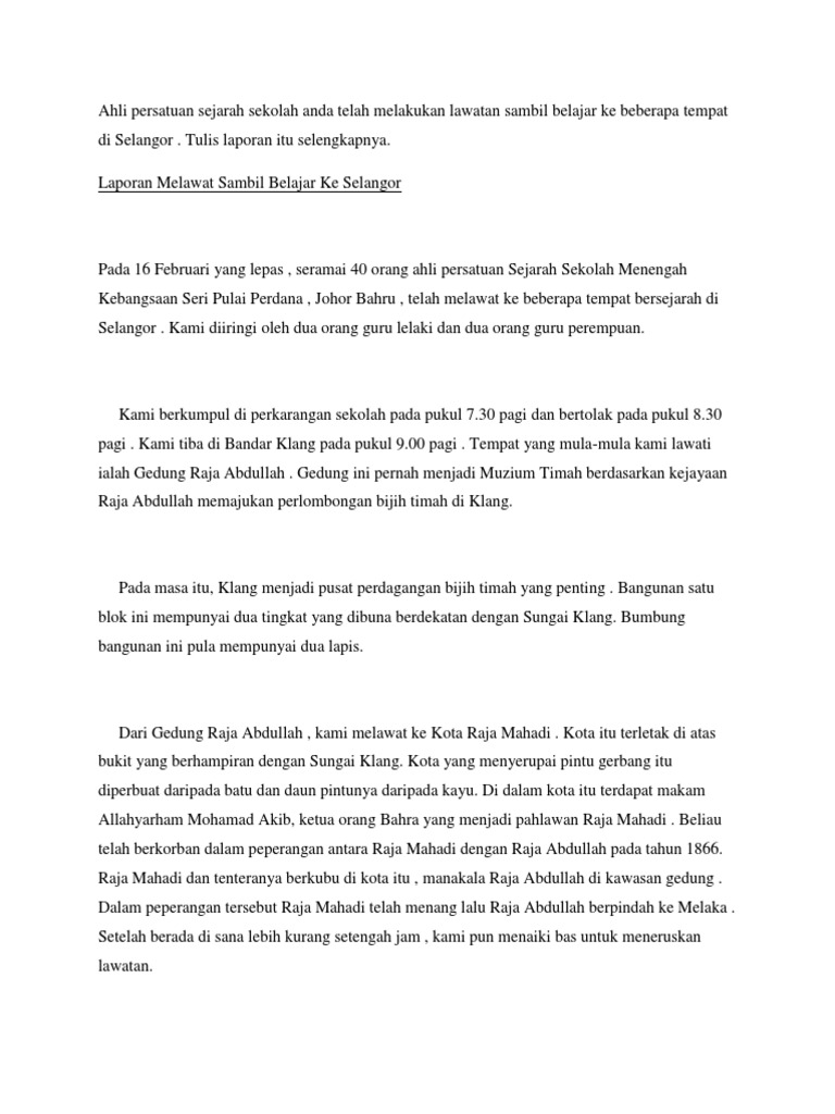 Ahli Persatuan Sejarah Sekolah Anda Telah Melakukan Lawatan Sambil Belajar Ke Beberapa Tempat Di Selangor Pdf